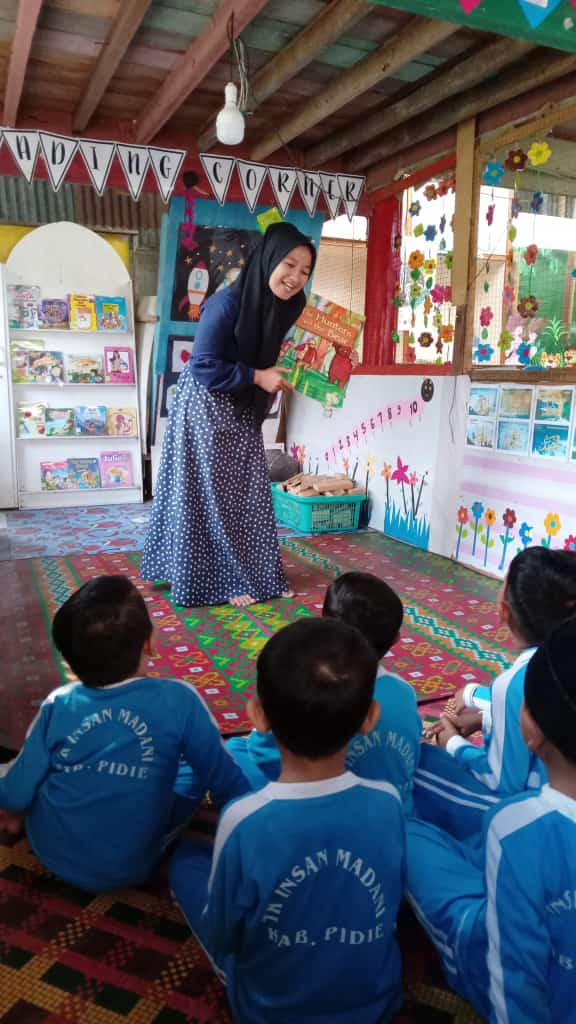 “Saya senang sekali bisa ikut terlibat dalam kegiatan ini dan membacakan cerita untuk anak-anak.” Kata Citra, relawan Cinta Baca yang tinggal dekat Pos Baca Pidie di Aceh. Citra dan temannya, Putri selalu membantu dalam setiap kegiatan yang diadakan di Pos Baca Pidie.